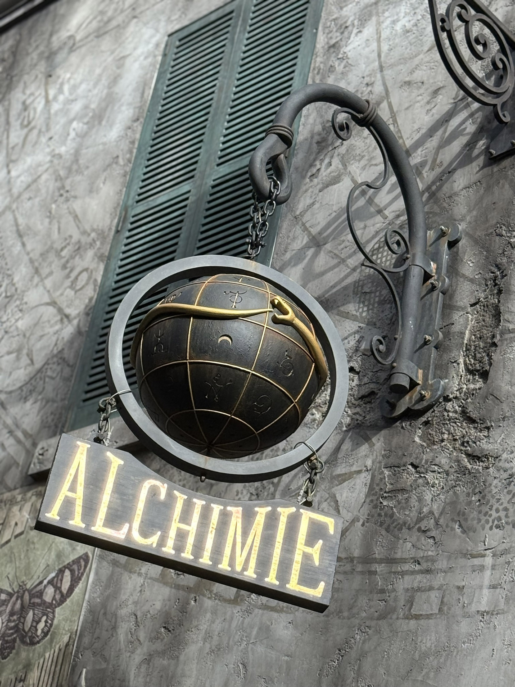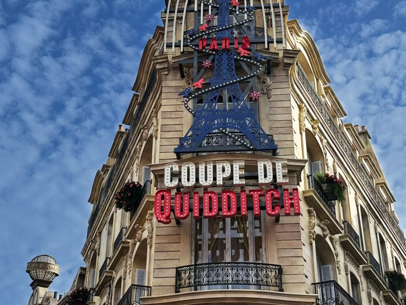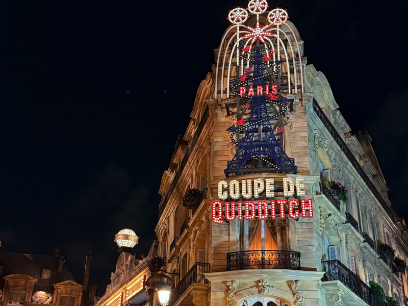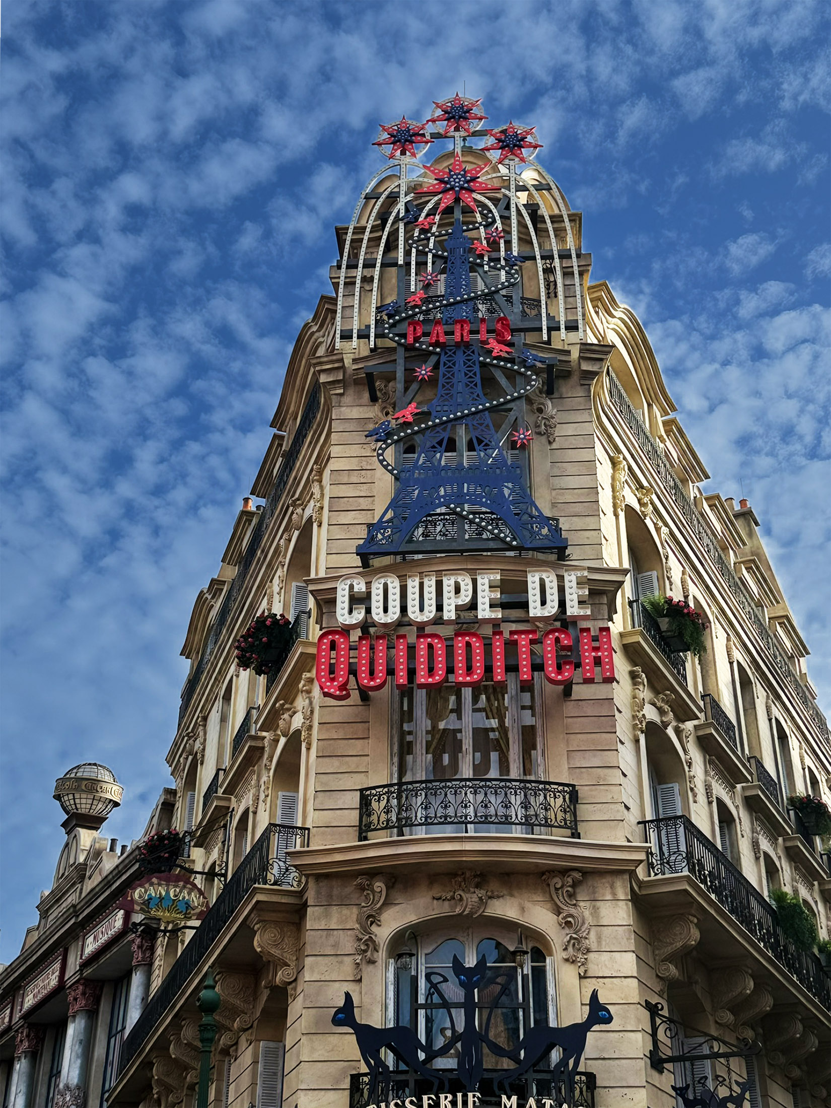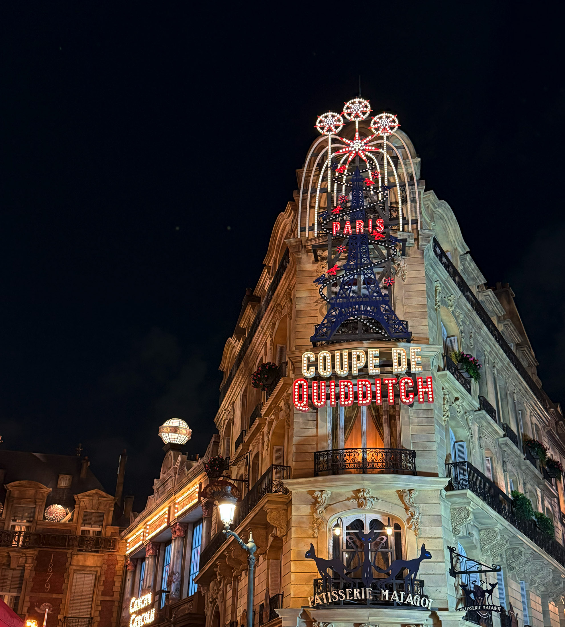 The project’s signature focal point is the towering, 30-foot Coup de Quidditch marquee. Serving as the first major landmark inside the Ministry of Magic-themed land, this marquee celebrates the wizarding world’s most beloved sport with grandeur and authenticity. Fabricated to evoke the aesthetic of 1920s magical Paris, it combines traditional channel lettering with historic theatrical styling. Each letter features a mix of static and chasing illumination and is treated with custom scenic finishes to achieve an authentically aged appearance.