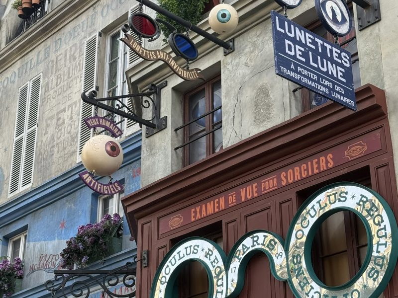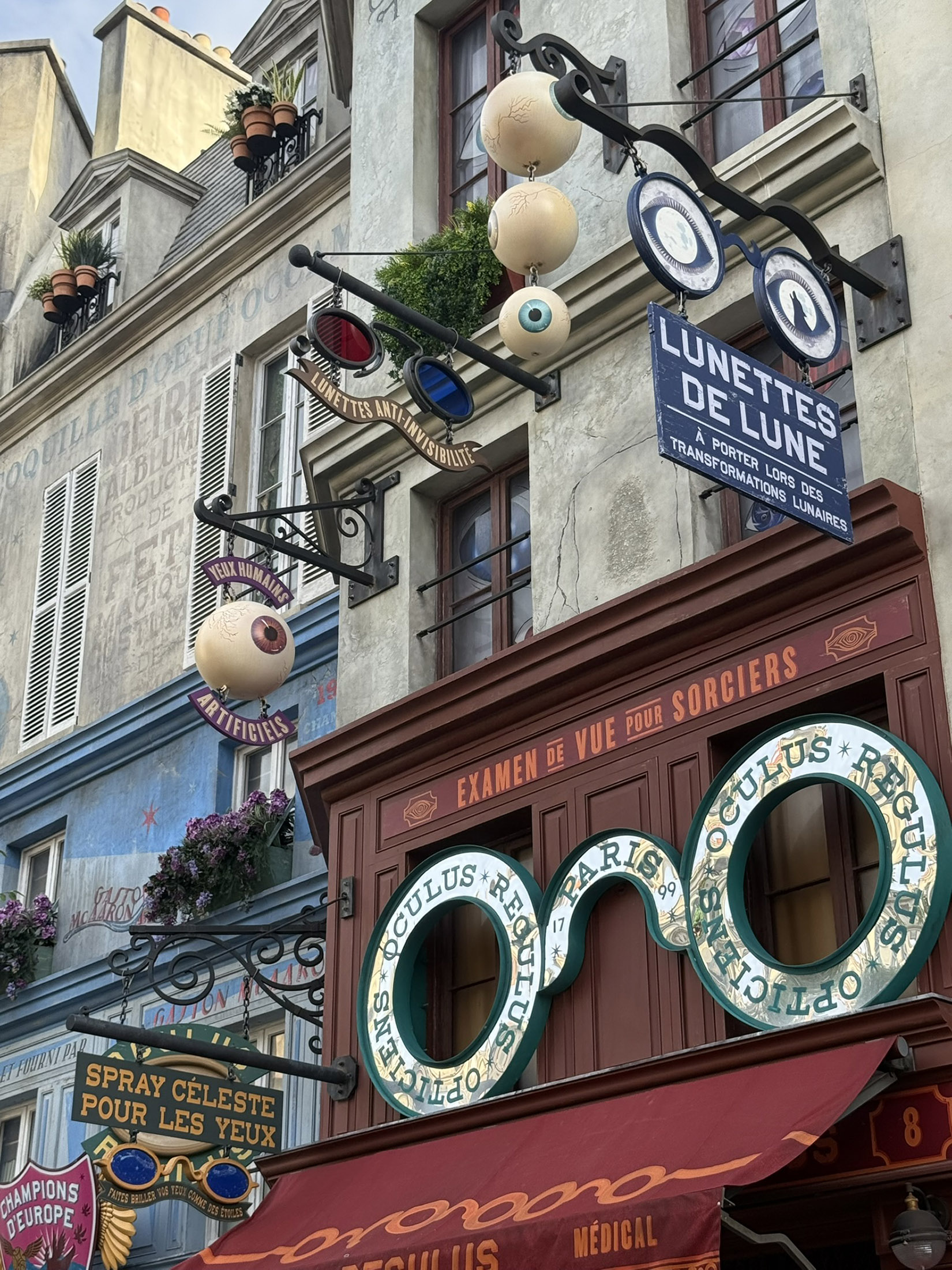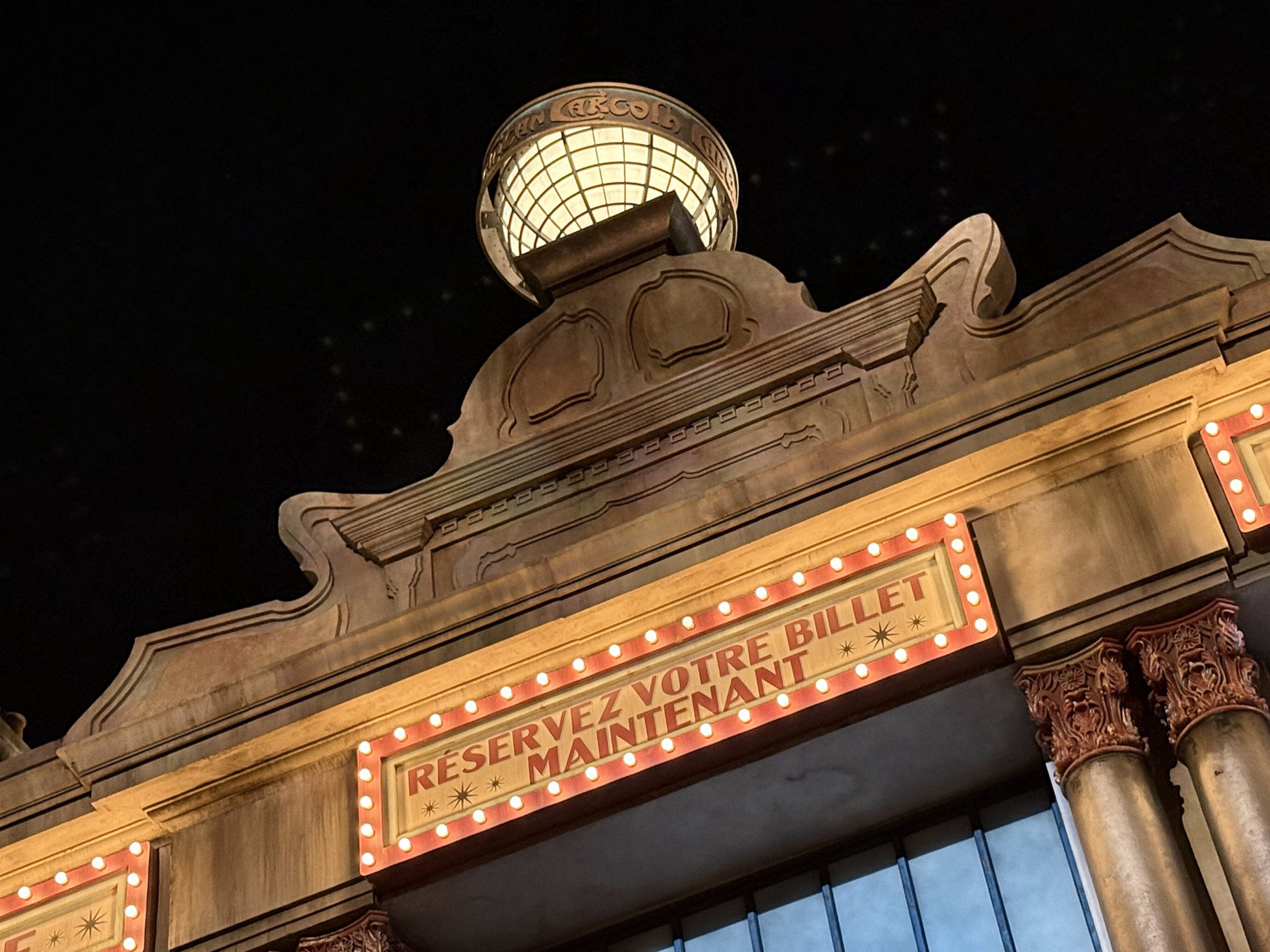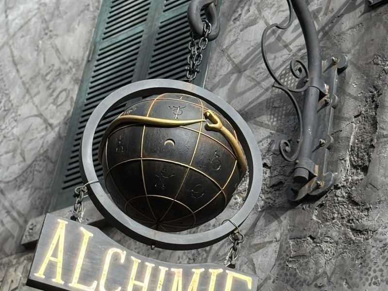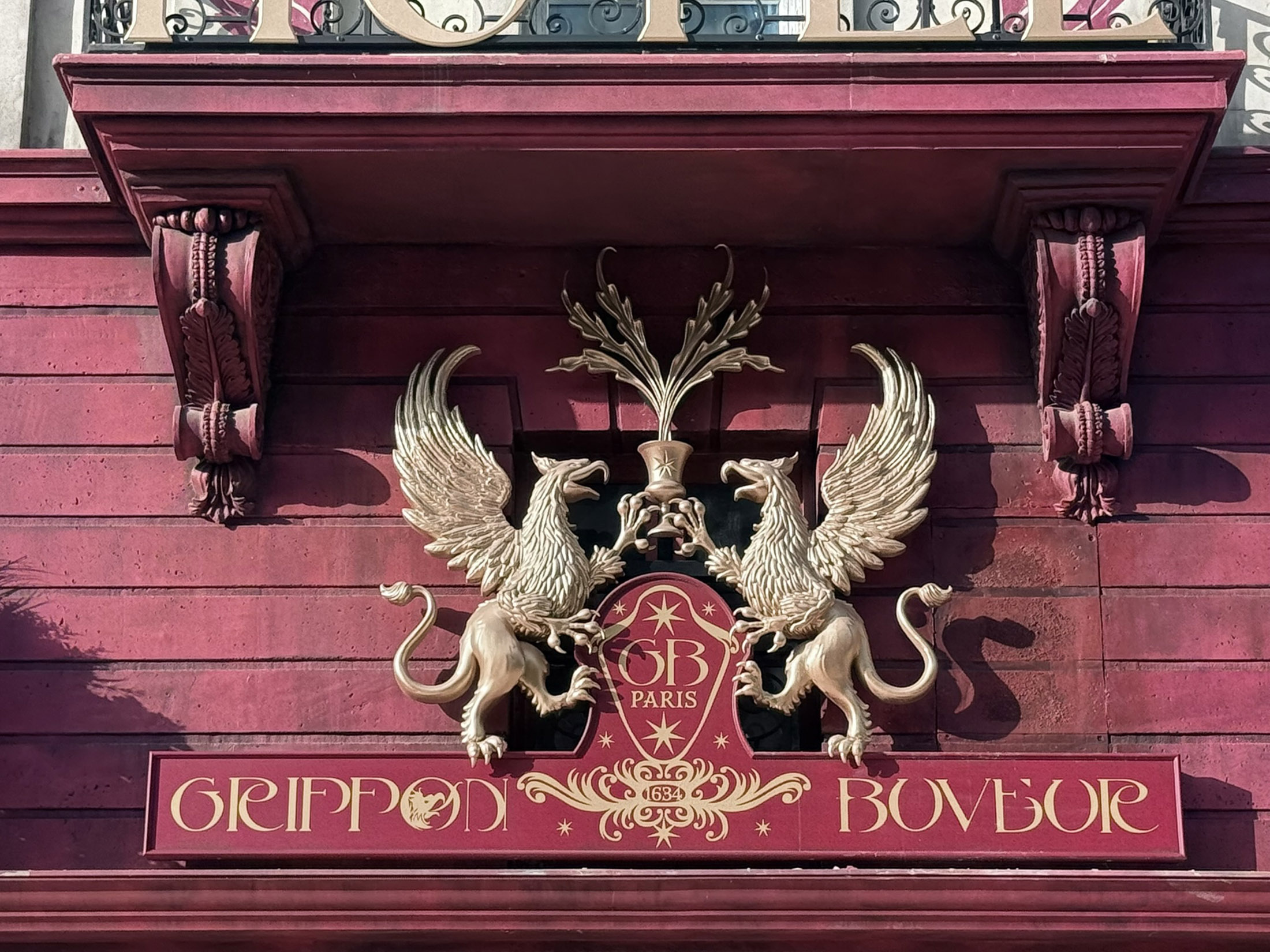 The project’s signature focal point is the towering, 30-foot Coup de Quidditch marquee. Serving as the first major landmark inside the Ministry of Magic-themed land, this marquee celebrates the wizarding world’s most beloved sport with grandeur and authenticity. Fabricated to evoke the aesthetic of 1920s magical Paris, it combines traditional channel lettering with historic theatrical styling. Each letter features a mix of static and chasing illumination and is treated with custom scenic finishes to achieve an authentically aged appearance.